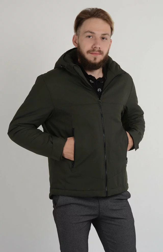 Мужская весенняя куртка из плотной водоотталкивающей плащевки табачного цвета.Капюшон несъемный и затягивается резинкой с фиксатором.Утеплитель силикон 120.Подкладка стеганая.По низу изделия есть затяжки.Спинка длиннее переда. На изделии есть 2 внутренних кармана и 2 кармана на полочке.По низу рукава есть патик с липучкой,с помощью которого регулируется ширина низа рукава