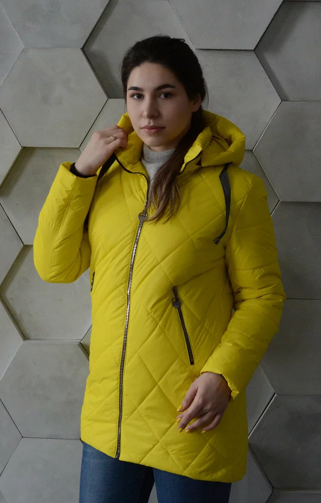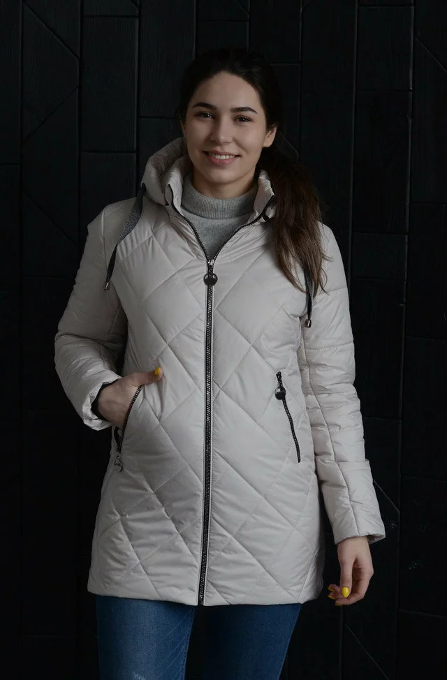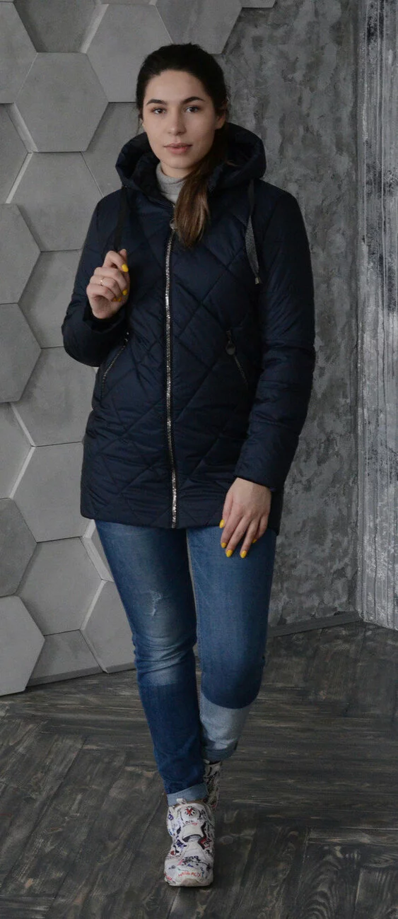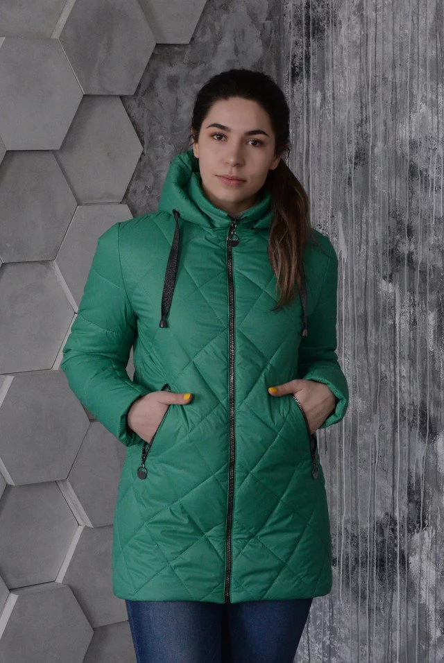 Куртка женская демисезонная удлиненная.Оригинальный полуприталенный силуэт подчеркнет достоинства фигуры.Молния серебристого цвета по центру и на карманах придают изделию изысканный вид.Съемный капюшон удобен и практичен.По спинке низ плавно идет на удлиннение. Используется ткань мемори-лаке.